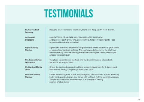 Mrs. Kumud Advani The place, the ambience, the food, and the treatments were all excellent.