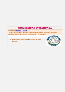 UNIVERSIDAD IXTLAHUACA Maestrías: www.uicui.edu.mx Dirección: Km. 1 Carr. Ixtlahuaca-Jiquipilco, Col. Barrio San Pedro, Ixtlahuaca, Estado de México, C.P. 50740. Tel. 283 1012, 712 283 0365. Maestría en Educación y Administración Escolar.