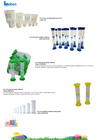 Set de 10 relojes de arena de 3 minutos, fabricadas en contenedor de plástico, disponible en colores.. Empaque