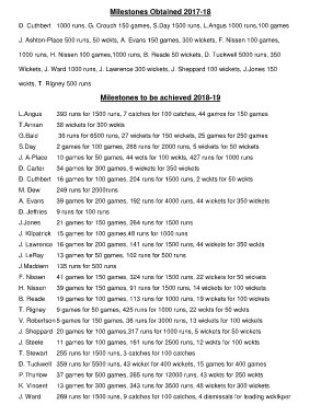 D. Cuthbert 1000 runs, G. Crouch 150 games, S.Day 1500 runs, L.Angus 1000 runs,100 games