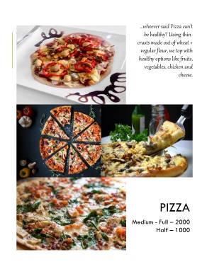 …whoever said Pizza can’t be healthy? Using thin- crusts made out of wheat + regular flour, we top with healthy options like fruits, vegetables, chicken and cheese. PIZZA Medium - Full – 2000 Half – 1000