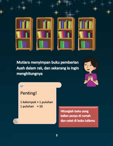 Mutiara menyimpan buku pemberian Ayah dalam rak, dan sekarang ia ingin menghitungnya Penting! 1 kelompok = 1 puluhan 1 puluhan = 10 Hitunglah buku yang kalian punya di rumah dan catat di buku tulismu 5