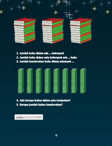 1. Jumlah buku diatas ada … kelompok 2. Jumlah buku dalam satu kelompok ada … buku 3. Jumlah keseluruhan buku diatas sebanyak … 4. Ada berapa kubus dalam satu tumpukan? 5. Berapa jumlah kubus keseluruhan? 6