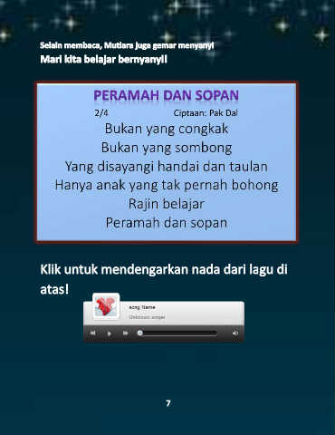 Selain membaca, Mutiara juga gemar menyanyi Mari kita belajar bernyanyi! Klik untuk mendengarkan nada dari lagu di atas! https://bit.ly/2YsD5Sb 7