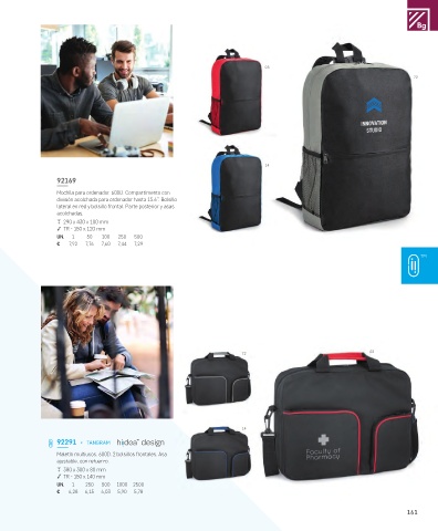 lateral en red y bolsillo frontal. Parte posterior y asas
