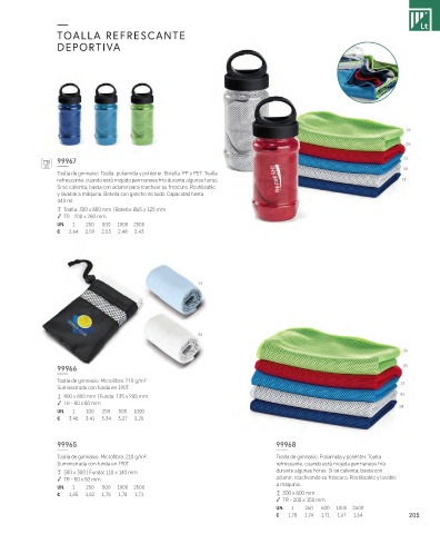 Toalla de gimnasio. Toalla: poliamida y poliéster. Botella: PP y PET. Toalla