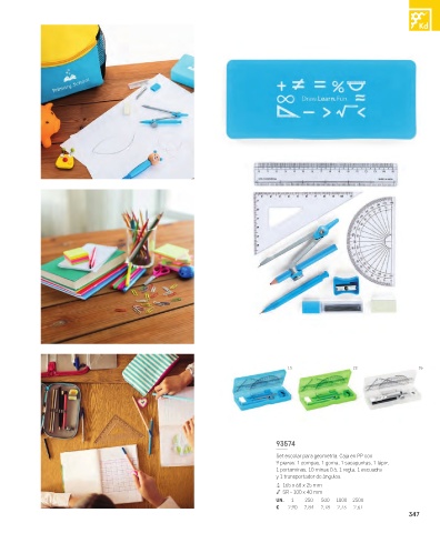 9 piezas: 1 compas, 1 goma, 1 sacapuntas, 1 lápiz,
