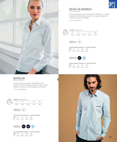 poliéster: 115 g/m². Manga larga. Botón invisible de cuello.