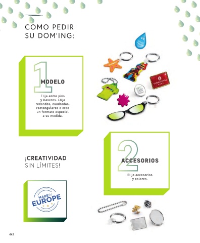COMO PEDIR SU DOM'ING: MODELO Elija entre pins y llaveros. Elija redondos, cuadrados, rectangulares o cree un formato especial a su medida. ¡CREATIVIDAD ACCESORIOS SIN LÍMITES! Elija accesorios y colores. 442