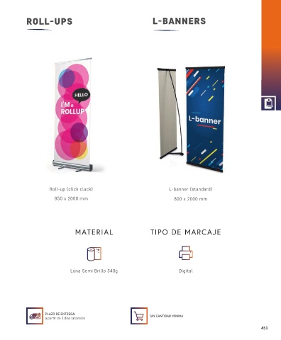 ROLL UPS L BANNERS Roll-up (click clack) L-banner (standard) 850 x 2000 mm 800 x 2000 mm MATERIAL TIPO DE MARCAJE Lona Semi Brillo 340g Digital PLAZO DE ENTREGA: a partir de 3 días laborales SIN CANTIDAD MÍNIMA 451