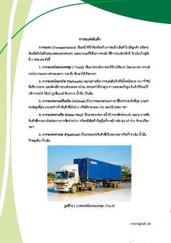 1. การขนส่งโดยรถบรรทุก ( Truck) เป็นการขนส่งทางบกที่นิยมใช้มาก โดยเฉพาะการขนส่ง