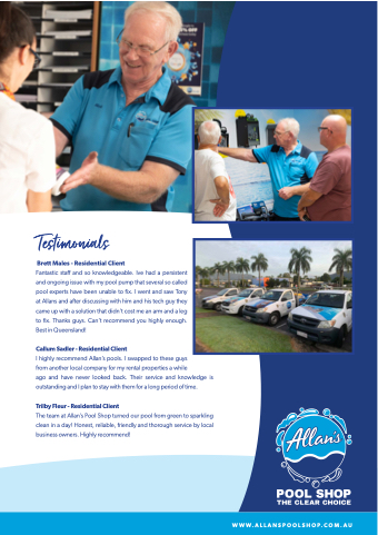 Fantastic staff and so knowledgeable. Ive had a persistent and ongoing issue with my pool pump that several so called pool experts have been unable to fix. I went and saw Tony at Allans and after discussing with him and his tech guy they came up with a solution that didn’t cost me an arm and a leg to fix. Thanks guys. Can’t recommend you highly enough. Best in Queensland!