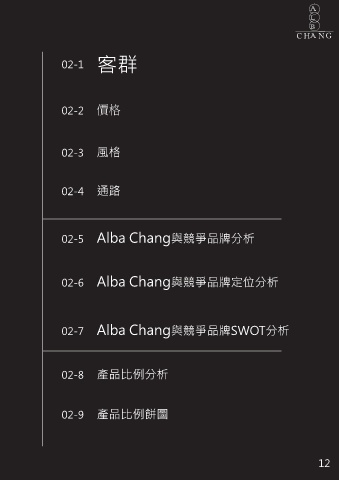ALBA C H N G 02-1 客群 02-2 ᄆࣸ 02-3 風格 02-4 通路 02-5 Alba Chang與競爭品牌分析 02-6 Alba Chang與競爭品牌定位分析 02-7 Alba Chang與競爭品牌SWOT分析 02-8 產品比例分析 02-9 產品比例餅圖 12