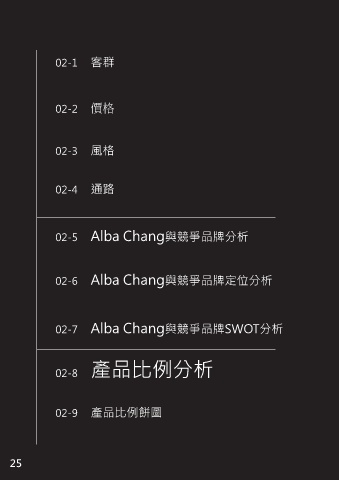 02-1 客群 02-2 ᄆࣸ 02-3 風格 02-4 通路 02-5 Alba Chang與競爭品牌分析 02-6 Alba Chang與競爭品牌定位分析 02-7 Alba Chang與競爭品牌SWOT分析 02-8 產品比例分析 02-9 產品比例餅圖 25