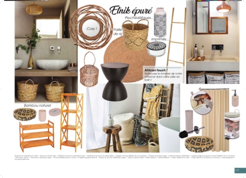 / Miroir kubu d63cm / Porte-savon céramique taupe / Porte-serviettes bambou naturel / Poubelle à pédale métal 3l / Rideau de douche 180xh200cm taupe / Table d’appoint métal / Panier d20x6cm / Panier d25x8cm / Panier d26x22cm en osier / Panier d30x10cm en bambou noir/nature / Vase transparent +