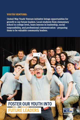 United Way Youth Venture initiative brings opportunities for growth to our future leaders. Local students from elementary school to college level, learn lessons in leadership, social responsibility, and professional communication - preparing them to be valuable community leaders.