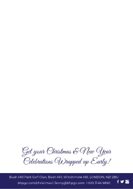 Get your Christmas & New Year Celebrations Wrapped up Early! Bush Hill Park Golf Club, Bush Hill, Winchmore Hill, LONDON, N21 2BU bhpgc.com/christmas l Jenny@bhpgc.com l 020 3146 9890