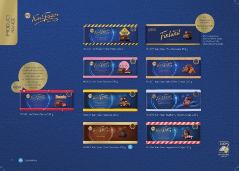 401532 Karl Fazer Dumle 250 g 401534 Karl Fazer Hazelnut 250 g 401870 Karl Fazer Blueberry Yoghurt Crisps 235 g