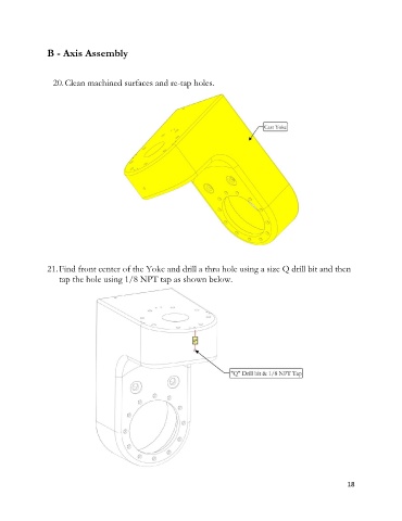 B - Axis Assembly 20. Clean machined surfaces and re-tap holes. 21. Find front center of the Yoke and drill a thru hole using a size Q drill bit and then tap the hole using 1/8 NPT tap as shown below. 18