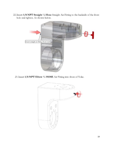22. Insert 1/8 NPT Straight ¼ Hose Straight Air Fitting to the backside of the front hole and tighten. As shown below. 23. Insert 1/8 NPT Elbow ¼ HOSE Air Fitting into front of Yoke. 19