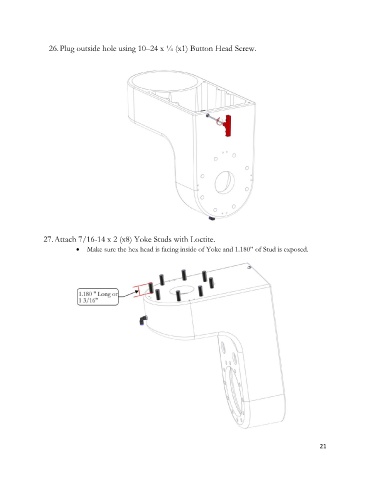 26. Plug outside hole using 10–24 x ¼ (x1) Button Head Screw. 27. Attach 7/16-14 x 2 (x8) Yoke Studs with Loctite. • Make sure the hex head is facing inside of Yoke and 1.180” of Stud is exposed. 21