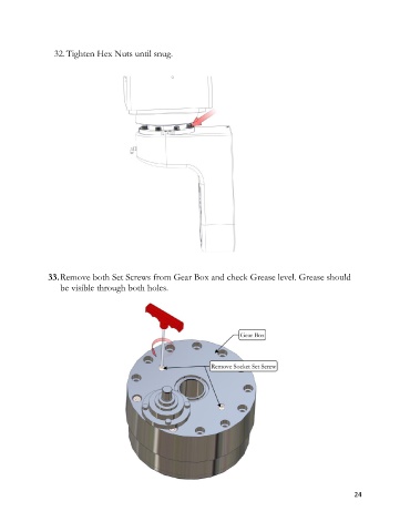 32. Tighten Hex Nuts until snug. 33. Remove both Set Screws from Gear Box and check Grease level. Grease should be visible through both holes. 24
