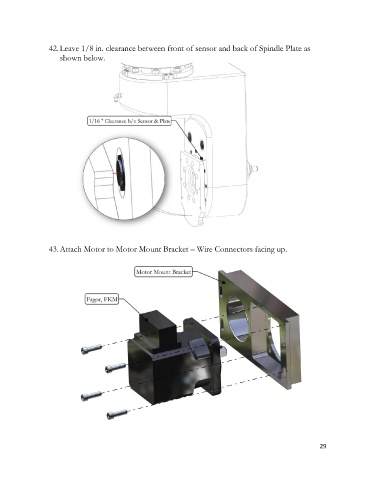 42. Leave 1/8 in. clearance between front of sensor and back of Spindle Plate as shown below. 43. Attach Motor to Motor Mount Bracket – Wire Connectors facing up. 29