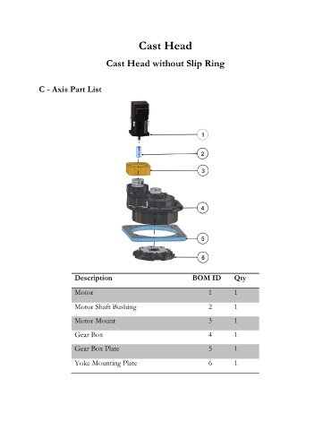 Cast Head Cast Head without Slip Ring C - Axis Part List Description BOM ID Qty Motor 1 1 Motor Shaft Bushing 2 1 Motor Mount 3 1 Gear Box 4 1 Gear Box Plate 5 1 Yoke Mounting Plate 6 1