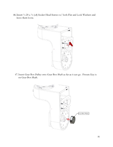 46. Insert ¼-20 x ¾ (x4) Socket Head Screws w/ both Flat and Lock Washers and leave them loose. 47. Insert Gear Box Pulley onto Gear Box Shaft as far as it can go. Ensure Key is on Gear Box Shaft. 31