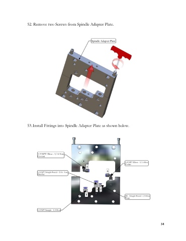 52. Remove two Screws from Spindle Adapter Plate. 53. Install Fittings into Spindle Adapter Plate as shown below. 34
