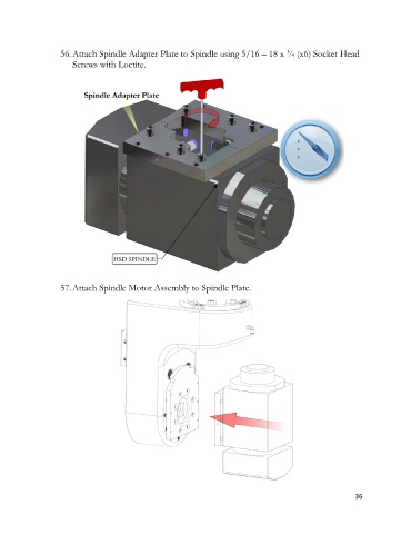 56. Attach Spindle Adapter Plate to Spindle using 5/16 – 18 x ¾ (x6) Socket Head Screws with Loctite. 57. Attach Spindle Motor Assembly to Spindle Plate. 36