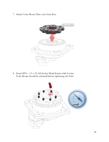 7. Attach Yoke Mount Plate onto Gear Box. 8. Insert M10 – 1.5 x 35 (x8) Socket Head Screws with Loctite. Yoke Mount should be centered before tightening the bolts. 45