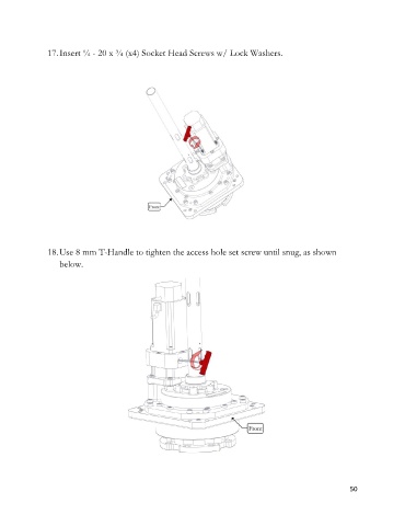 17. Insert ¼ - 20 x ¾ (x4) Socket Head Screws w/ Lock Washers. 18. Use 8 mm T-Handle to tighten the access hole set screw until snug, as shown below. 50