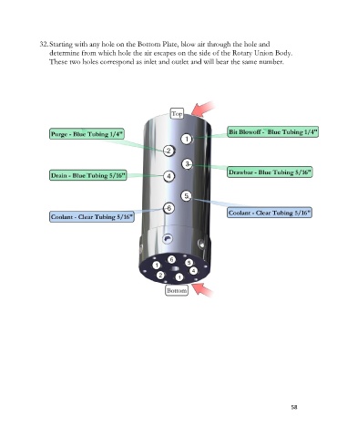 32. Starting with any hole on the Bottom Plate, blow air through the hole and determine from which hole the air escapes on the side of the Rotary Union Body. These two holes correspond as inlet and outlet and will bear the same number. 58