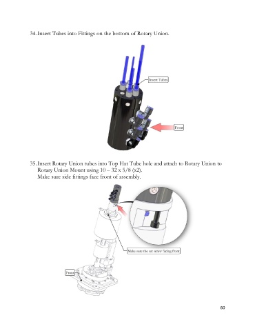 34. Insert Tubes into Fittings on the bottom of Rotary Union. 35. Insert Rotary Union tubes into Top Hat Tube hole and attach to Rotary Union to Rotary Union Mount using 10 – 32 x 5/8 (x2). Make sure side fittings face front of assembly. 60
