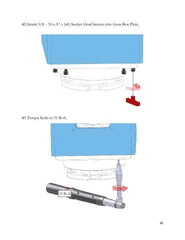 42. Insert 3/8 – 16 x 1 ¼ (x8) Socket Head Screws into Gear Box Plate. 43. Torque bolts to 51 lb-ft. 65