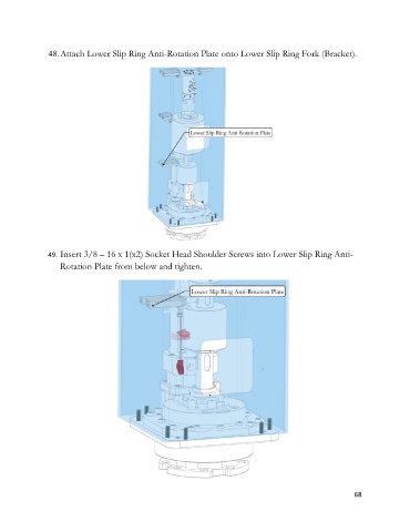 48. Attach Lower Slip Ring Anti-Rotation Plate onto Lower Slip Ring Fork (Bracket). 49. Insert 3/8 – 16 x 1(x2) Socket Head Shoulder Screws into Lower Slip Ring Anti- Rotation Plate from below and tighten. 68