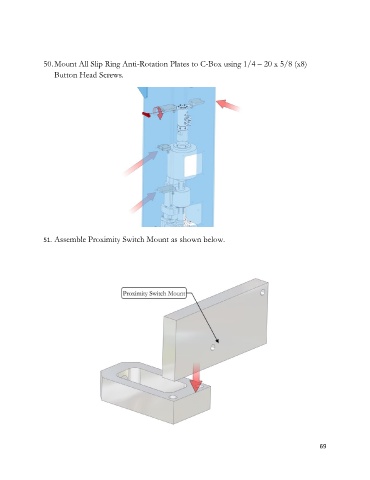 50. Mount All Slip Ring Anti-Rotation Plates to C-Box using 1/4 – 20 x 5/8 (x8) Button Head Screws. 51. Assemble Proximity Switch Mount as shown below. 69
