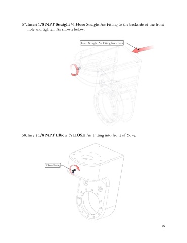 57. Insert 1/8 NPT Straight ¼ Hose Straight Air Fitting to the backside of the front hole and tighten. As shown below. 58. Insert 1/8 NPT Elbow ¼ HOSE Air Fitting into front of Yoke. 75