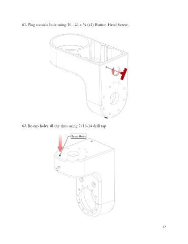 61. Plug outside hole using 10– 24 x ¼ (x1) Button Head Screw. 62. Re-tap holes all the thru using 7/16-14 drill tap 77