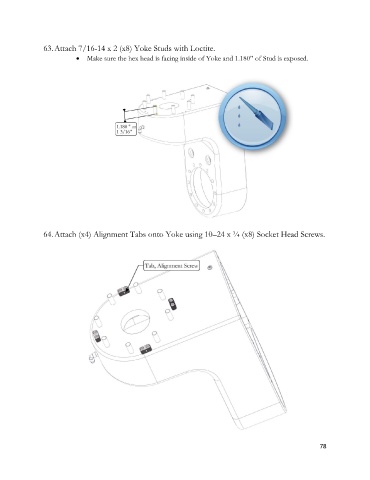 63. Attach 7/16-14 x 2 (x8) Yoke Studs with Loctite. • Make sure the hex head is facing inside of Yoke and 1.180” of Stud is exposed. 64. Attach (x4) Alignment Tabs onto Yoke using 10–24 x ¾ (x8) Socket Head Screws. 78