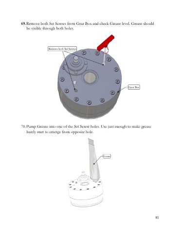 69. Remove both Set Screws from Gear Box and check Grease level. Grease should be visible through both holes. 70. Pump Grease into one of the Set Screw holes. Use just enough to make grease barely start to emerge from opposite hole. 81