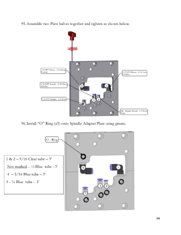 95. Assemble two Plate halves together and tighten as shown below. 96. Install “O” Ring (x5) onto Spindle Adapter Plate using grease. 1 & 2 – 5/16 Clear tube – 3’ Not marked – ¼ Blue tube –3’ 4 – 5/16 Blue tube – 3’ 5 - ¼ Blue tube – 3’ 94