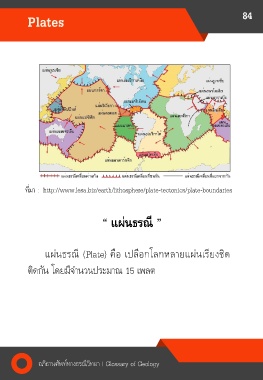 84 Plates ที่มา : http://www.lesa.biz/earth/lithosphere/plate-tectonics/plate-boundaries “ แผ่นธรณี ” แผ่นธรณี (Plate) คือ เปลือกโลกหลายแผ่นเรียงชิด ติดกัน โดยมีจ านวนประมาณ 15 เพลต อภิธานศัพท์ทางธรณีวิทยา | Glossary of Geology