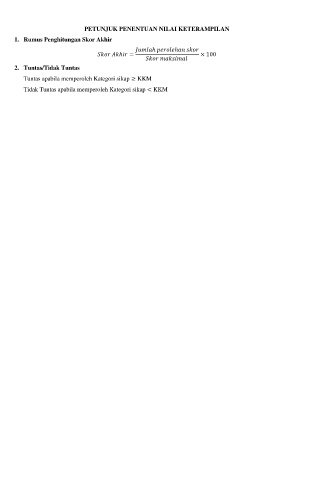 PETUNJUK PENENTUAN NILAI KETERAMPILAN 1. Rumus Penghitungan Skor Akhir ℎ ℎ ℎ = × 100 2. Tuntas/Tidak Tuntas Tuntas apabila memperoleh Kategori sikap ≥ KKM Tidak Tuntas apabila memperoleh Kategori sikap < KKM