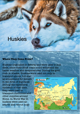 Huskies originated in Siberia and were used to pull sleds, since their thick coats could withstand the harsh weather and temperatures. During the gold rush in Alaska, Huskies were used not only to transport goods, but also
