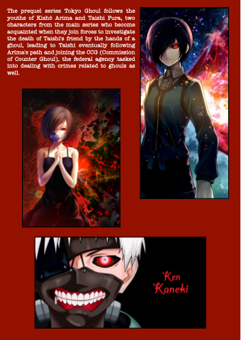 The prequel series Tokyo Ghoul follows the youths of KishÅ Arima and Taishi Fura, two characters from the main series who become acquainted when they join forces to investigate the death of Taishi's friend by the hands of a ghoul, leading to Taishi eventually following Arima's path and joining the CCG (Commission of Counter Ghoul), the federal agency tasked into dealing with crimes related to ghouls as well.