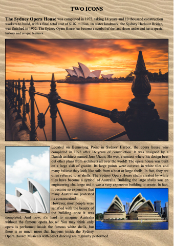 The Sydney Opera House was completed in 1973, taking 14 years and 10 thousand construction workers to build, with a final total cost of $102 million. Its sister landmark, the Sydney Harbour Bridge, was finished in 1932. The Sydney Opera House has become a symbol of the land down under and has a special history and unique features.