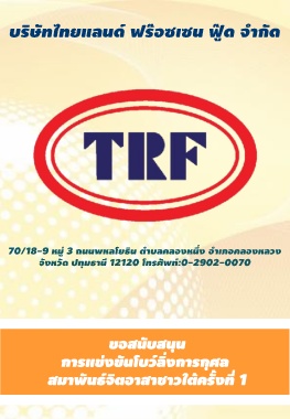 บริษัทไทยแลนด์ ฟร๊อซเซน ฟู๊ด จํากัด 70/18-9 หมู่ 3 ถนนพหลโยธิน ตําบลคลองหนึ่ง อําเภอคลองหลวง จังหวัด ปทุมธานี 12120 โทรศัพท์:0-2902-0070 ขอสนับสนุน การแข่งขันโบว์ลิ่งการกุศล สมาพันธ์จิตอาสาชาวใต้ครั้งที่ 1