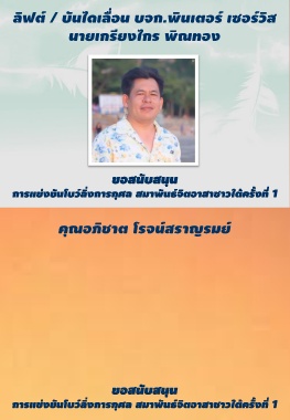 ลิฟต์ / บันไดเลื่อน บจก.พินเตอร์ เซอร์วิส นายเกรียงไกร พิณทอง ขอสนับสนุน การแข่งขันโบว์ลิ่งการกุศล สมาพันธ์จิตอาสาชาวใต้ครั้งที่ 1 คุณอภิชาต โรจน์สราญรมย์ ขอสนับสนุน การแข่งขันโบว์ลิ่งการกุศล สมาพันธ์จิตอาสาชาวใต้ครั้งที่ 1
